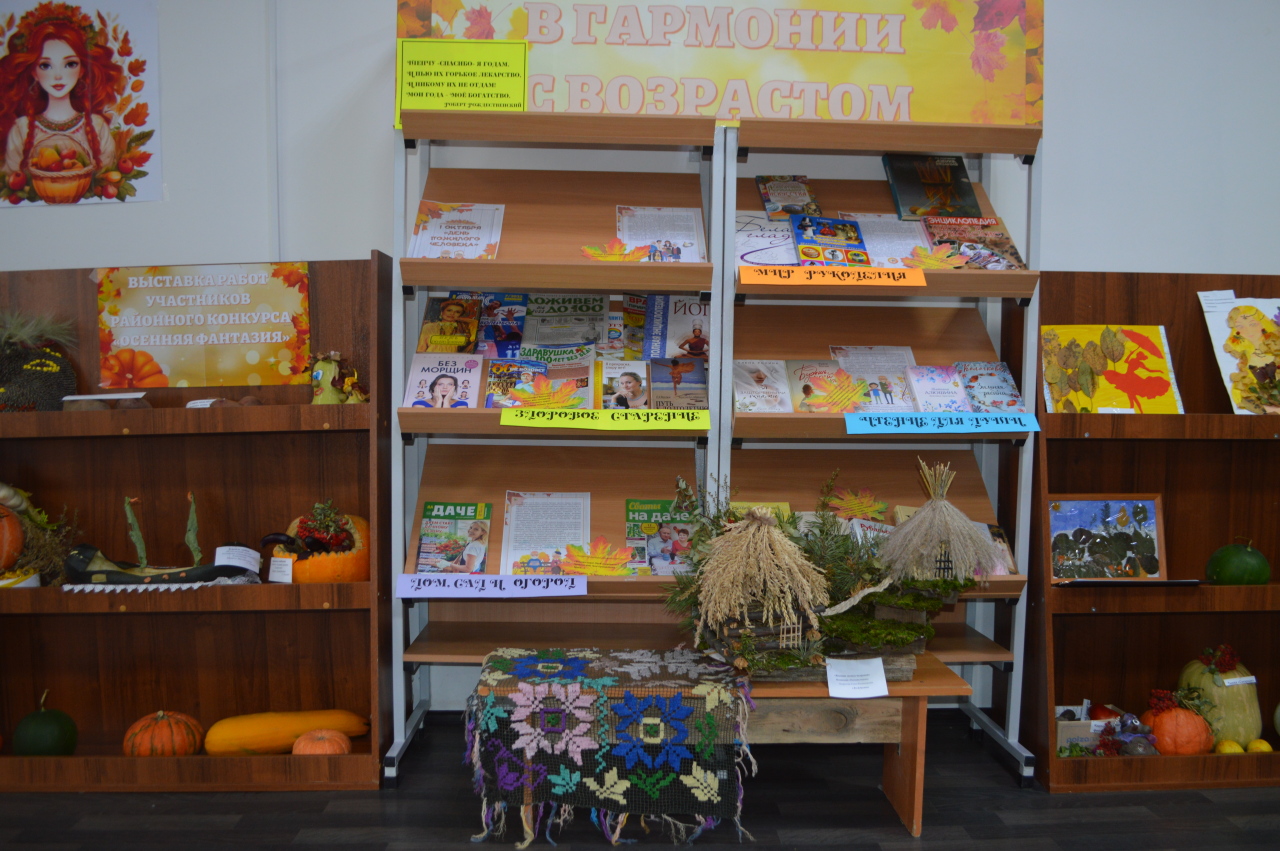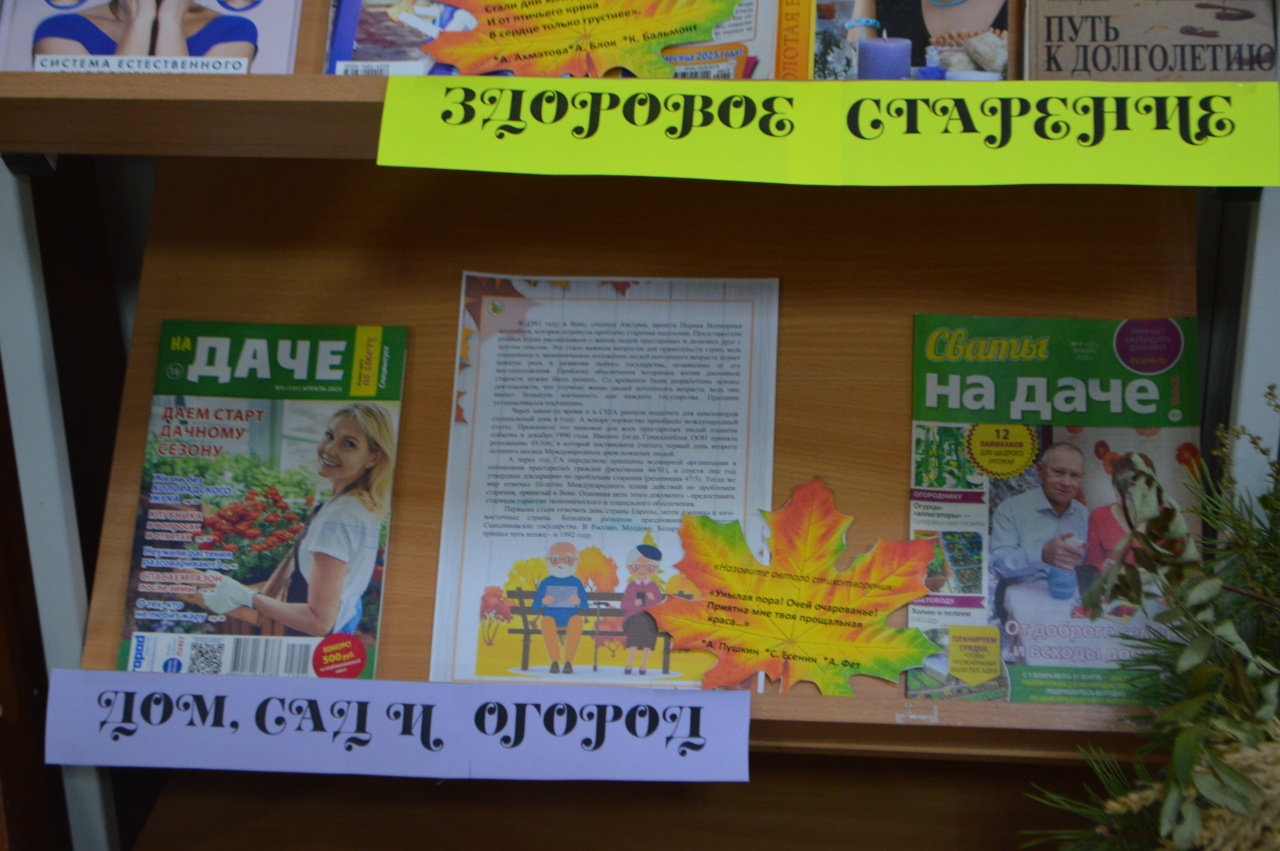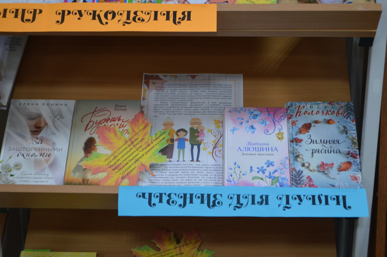 К празднованию Дня пожилого человека для посетителей "золотого" возраста в Центральной библиотеке подготовлена и представлена вниманию обзорная выставка с материалами из журналов и газет, а также книжные новинки по рукоделию, сохранению здоровья и активного образа жизни, творческому подходу к созданию уюта в доме и на усадьбе. Отдельная полка выставки была представлена книгами классиков и современных писателей и поэтов. Каждый из присутствующих смог выбрать для себя интересную информацию.
