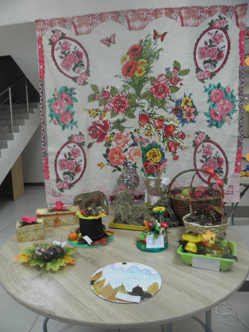 А неподалеку располагалась выставка-конкурс "Дары осени". Присутствующие смогли полюбоваться разнообразными детскими поделками, изготовленными из природного материала.