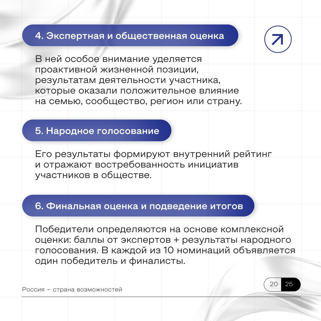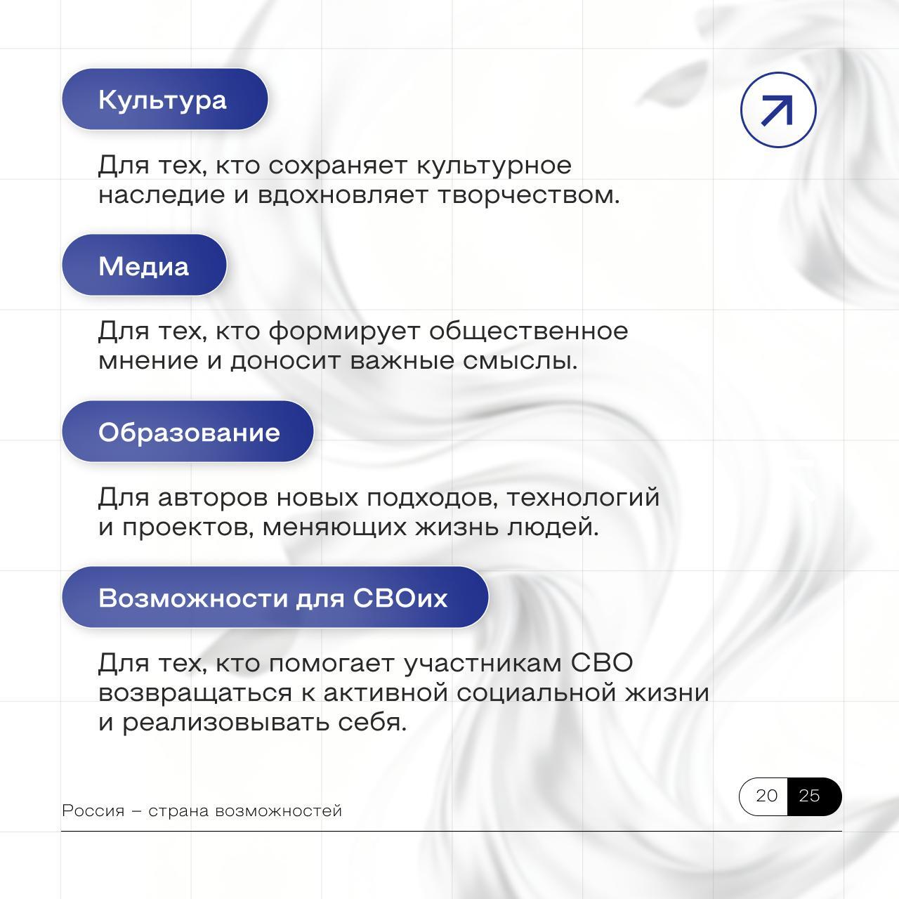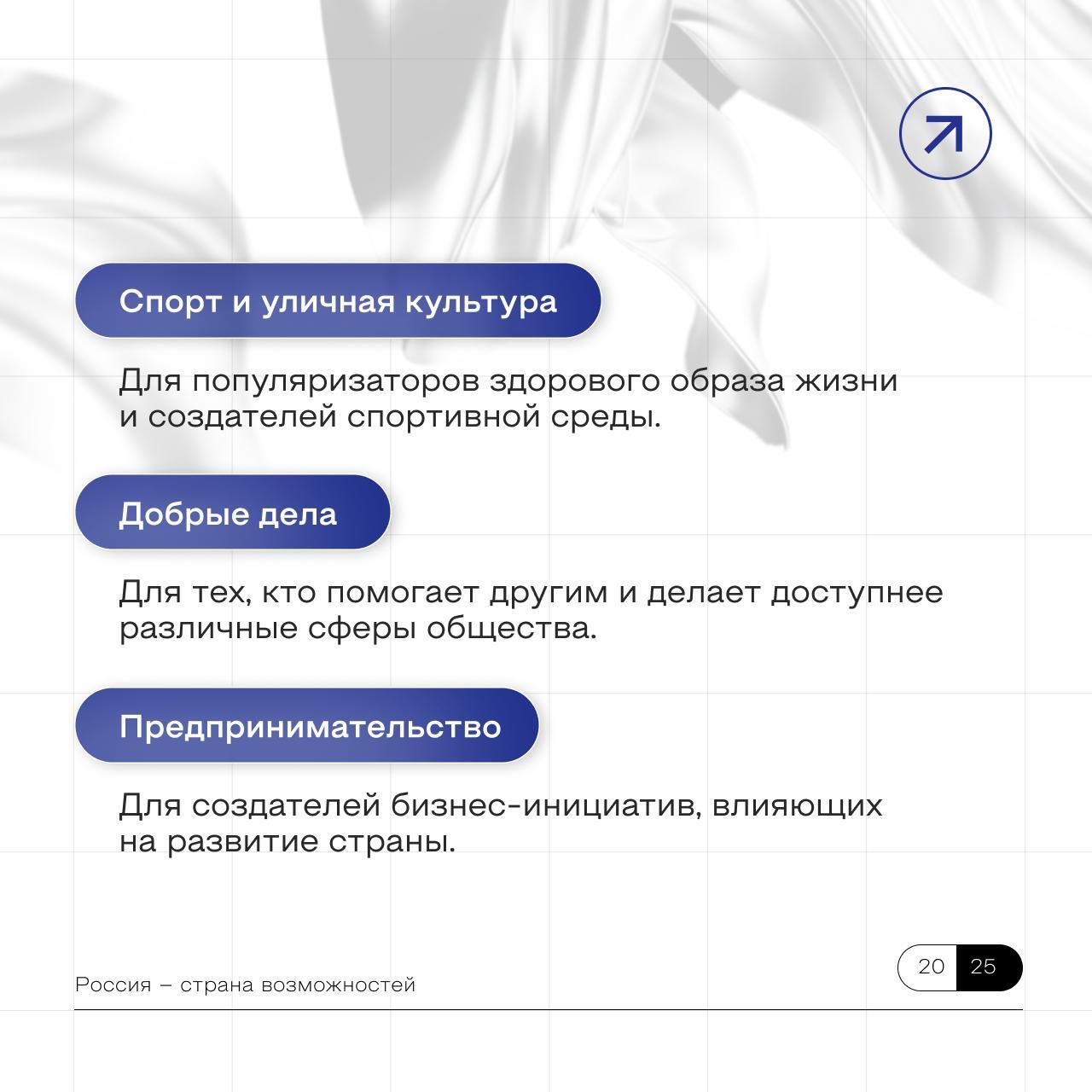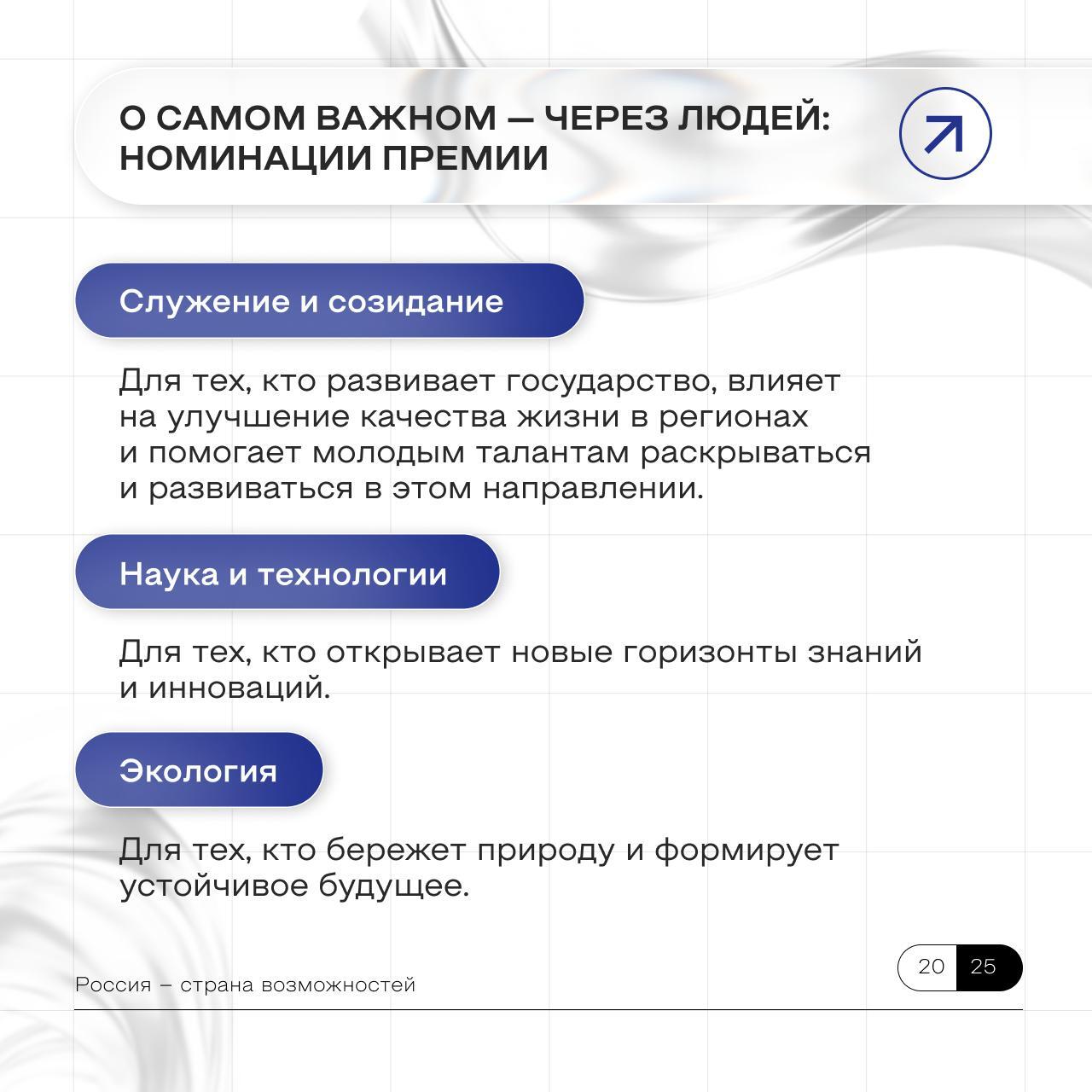 🔹Премия награждает тех, кто своим примером, деятельностью и отношением к миру создает возможности для других. В новом сезоне отбор участников проходит по 10 номинациям: