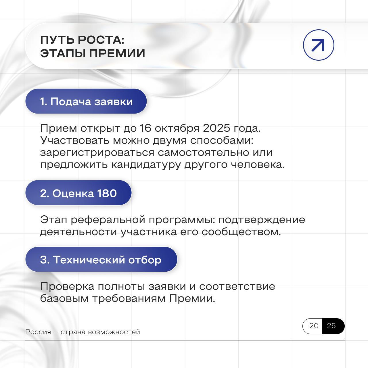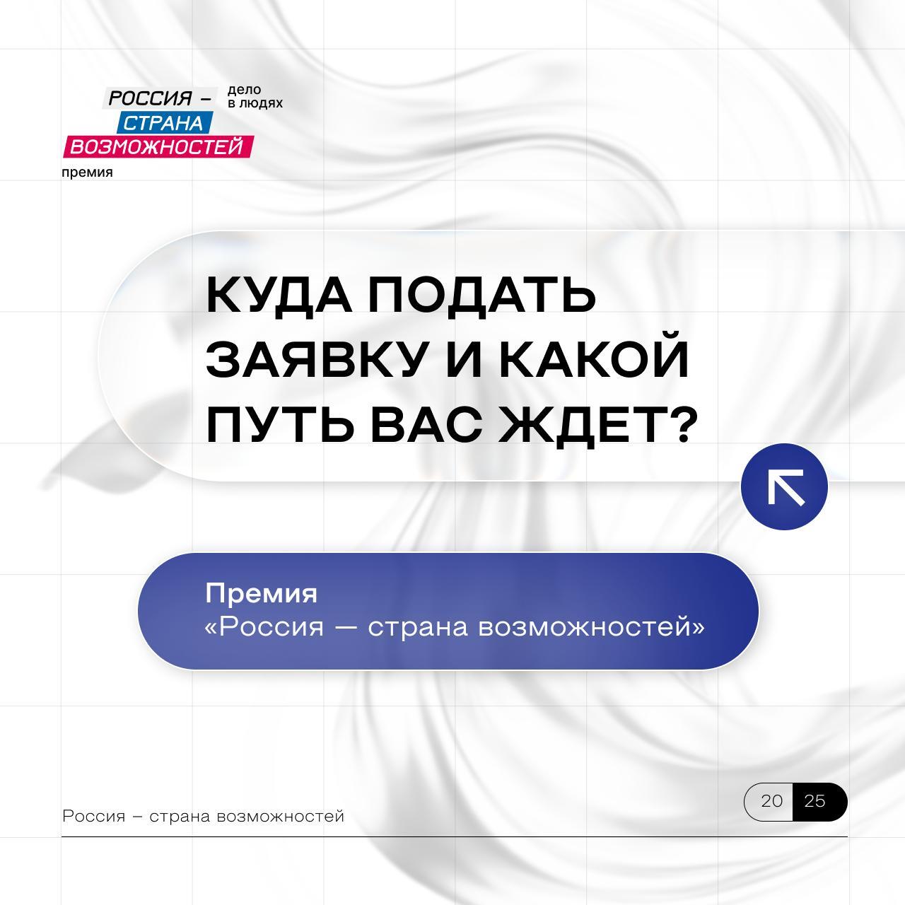 🔹Подать заявку может любой гражданин России с 18 лет. Регистрация открыта на официальном сайте премии до 16 октября 2025 года (https://premia.rsv.ru/). Премия "Россия – страна возможностей" учреждена по поручению Президента Российской Федерации для поддержки инициативных граждан. В 2024 году заявки на участие подали более 33 000 человек из 89 регионов России и 27 стран мира.