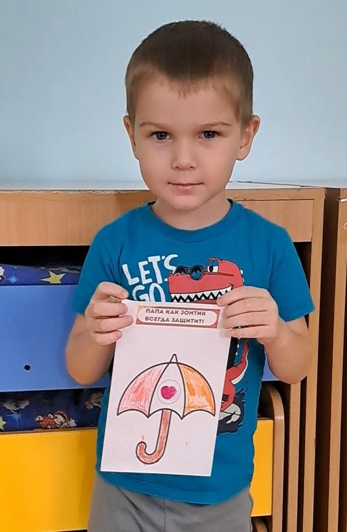 Также воспитанники приняли участие в творческой мастерской по изготовлению открытки "Папа, как зонтик, всегда защитит". Ее создание было простым, но наполненным глубоким смыслом. Малыши раскрашивали зонтик в два цвета, каждый из которых имел своё значение: красный – цвет папиной радости, оранжевый – цвет папиной заботы. В центр зонтика ребёнок ставил отпечаток-сердечко своим пальчиком, как символ любви. А в раздевалке группы была организована фотовыставка "Я и мой папа".