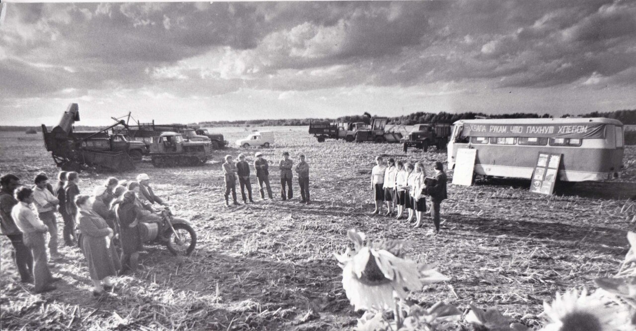 Выступление агитбригады Армизонского районного Дома культуры на поле совхоза "Восточный" во время уборки.