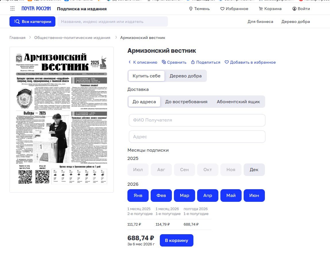 Кроме того, вы можете оформить подписку на районную газету "Армизонский вестник" онлайн. Наша газета включена в электронный каталог на сайте Почты России и, пройдя по ссылке https://podpiska.pochta.ru/press/ПВ590 , вы можете оформить подписку на издание с доставкой на дом с онлайн-оплатой. Также можно пройти на сайт с помощью QR-кода. Цена подписки на сайте 688,74 рубля.