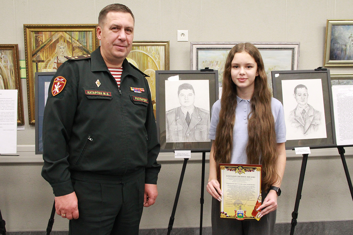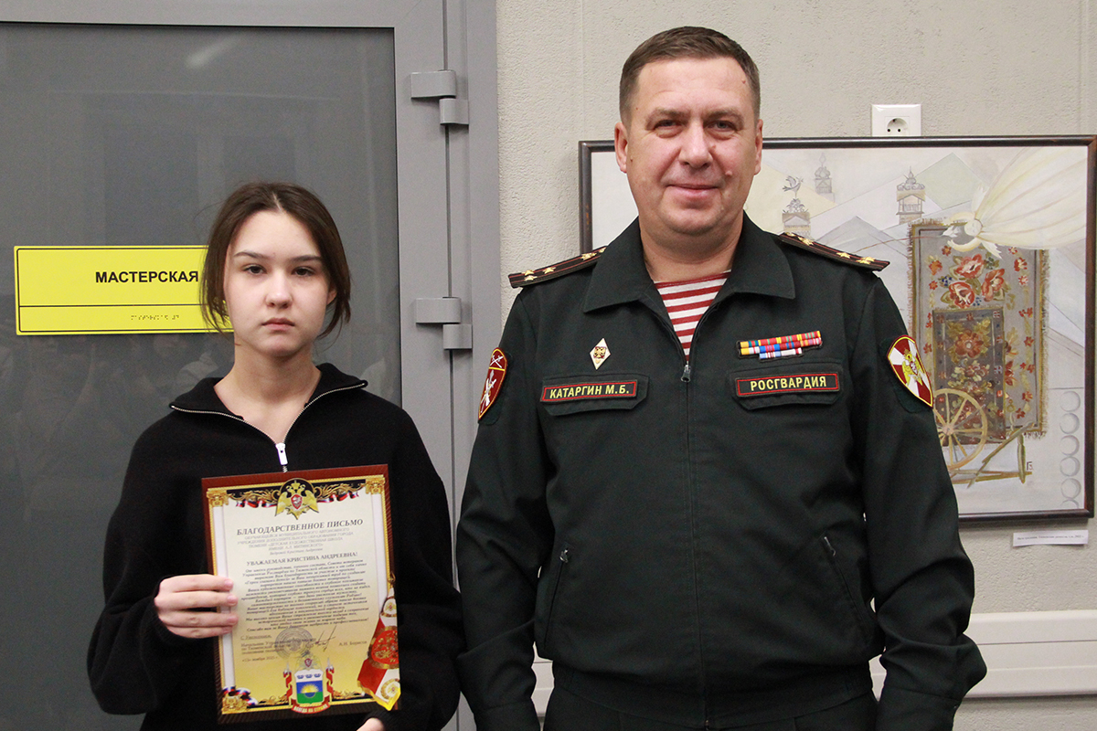 Заместитель начальника территориального управления Росгвардии полковник Михаил Катаргин в торжественной обстановке вручил руководителю патриотической организации "Мы с Вами" Наталье Логиновой, заместителю директора художественной школы им. А.П. Митинского Александру Васильеву, педагогам и детям благодарственные письма, выразив признательность за проведение значимого патриотического художественного проекта.