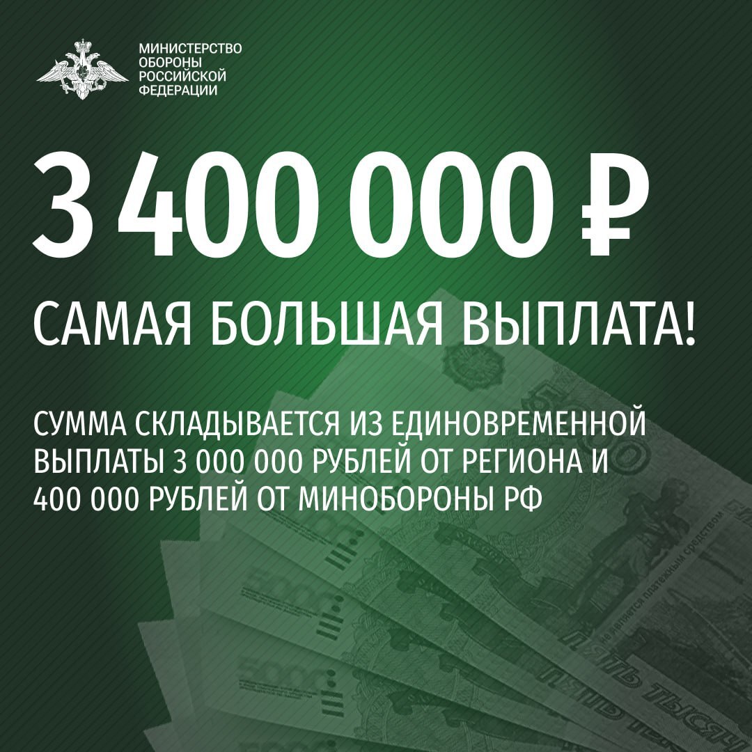 3 400 000 получают граждане, заключившие контракт с Минобороны РФ в военкоматах Тюменской области либо в пункте отбора на военную службу по контракту города Тюмени (ул. Республики, 2/1).