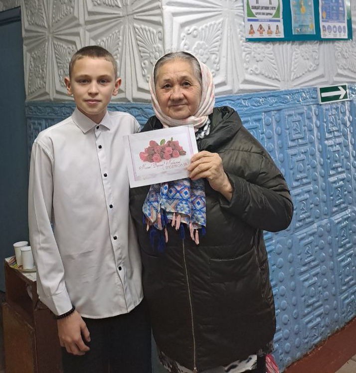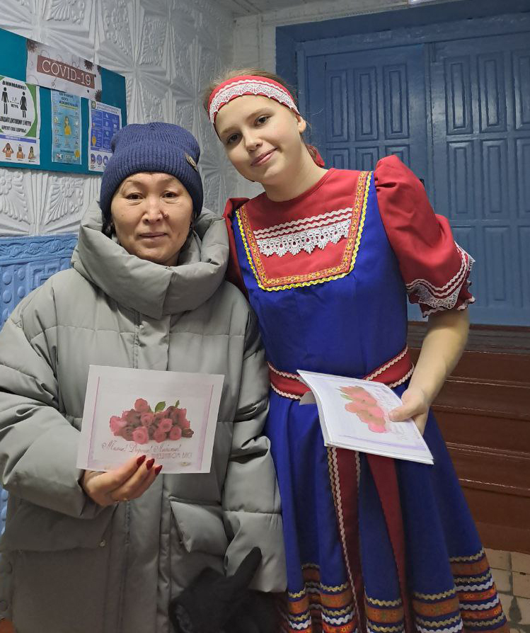 В рамках поздравительной акции "За всё тебя благодарю", участники концерта вручили открытки жительницам села, присутствовавшим в зале.