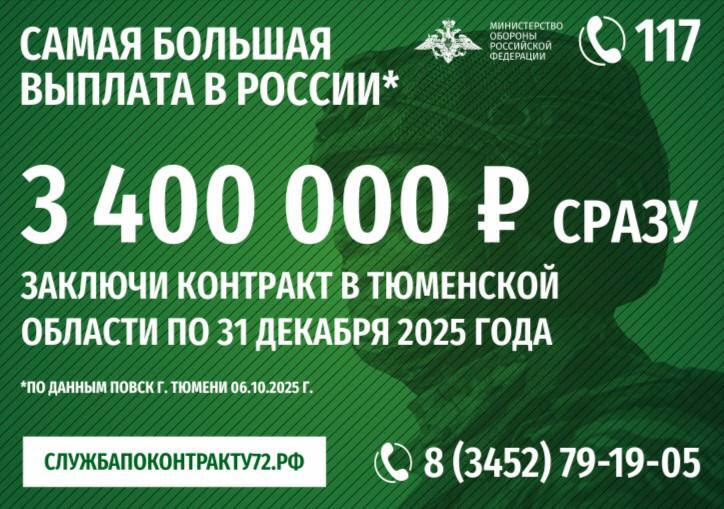 Граждане, которые вступят в ряды ВС РФ в военкоматах региона либо в пункте отбора на военную службу по контракту города Тюмени (ул. Республики, 2/1) до 31 декабря, получат самую большую выплату в стране - 3 400 000 рублей.