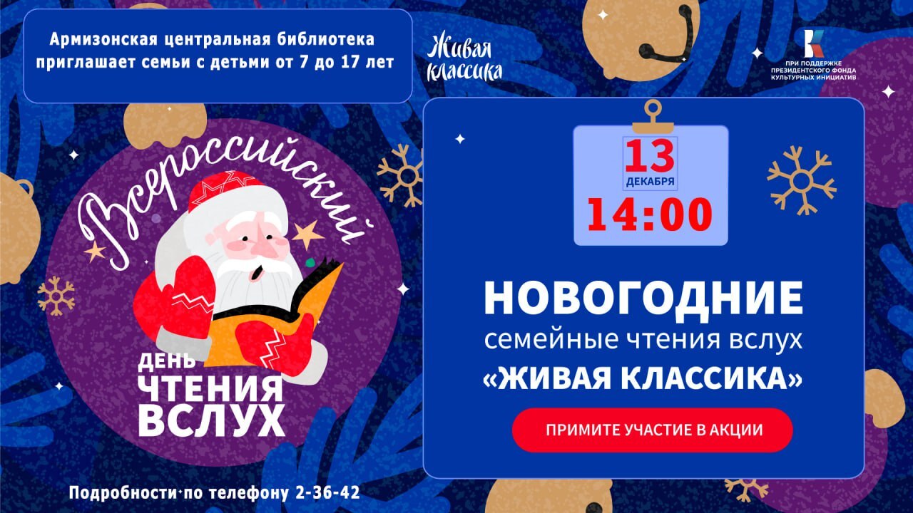 Ежегодная просветительская акция "Новогодние семейные чтения вслух. Живая классика", организованная при поддержке Президентского Фонда культурных инициатив, пройдёт 13 декабря 2025 года в 14:00. Семьи с детьми от 7 до 17 лет смогут собраться вместе в библиотеке, чтобы в тёплой, уютной атмосфере прочитать вслух отрывки из любимых книг.
