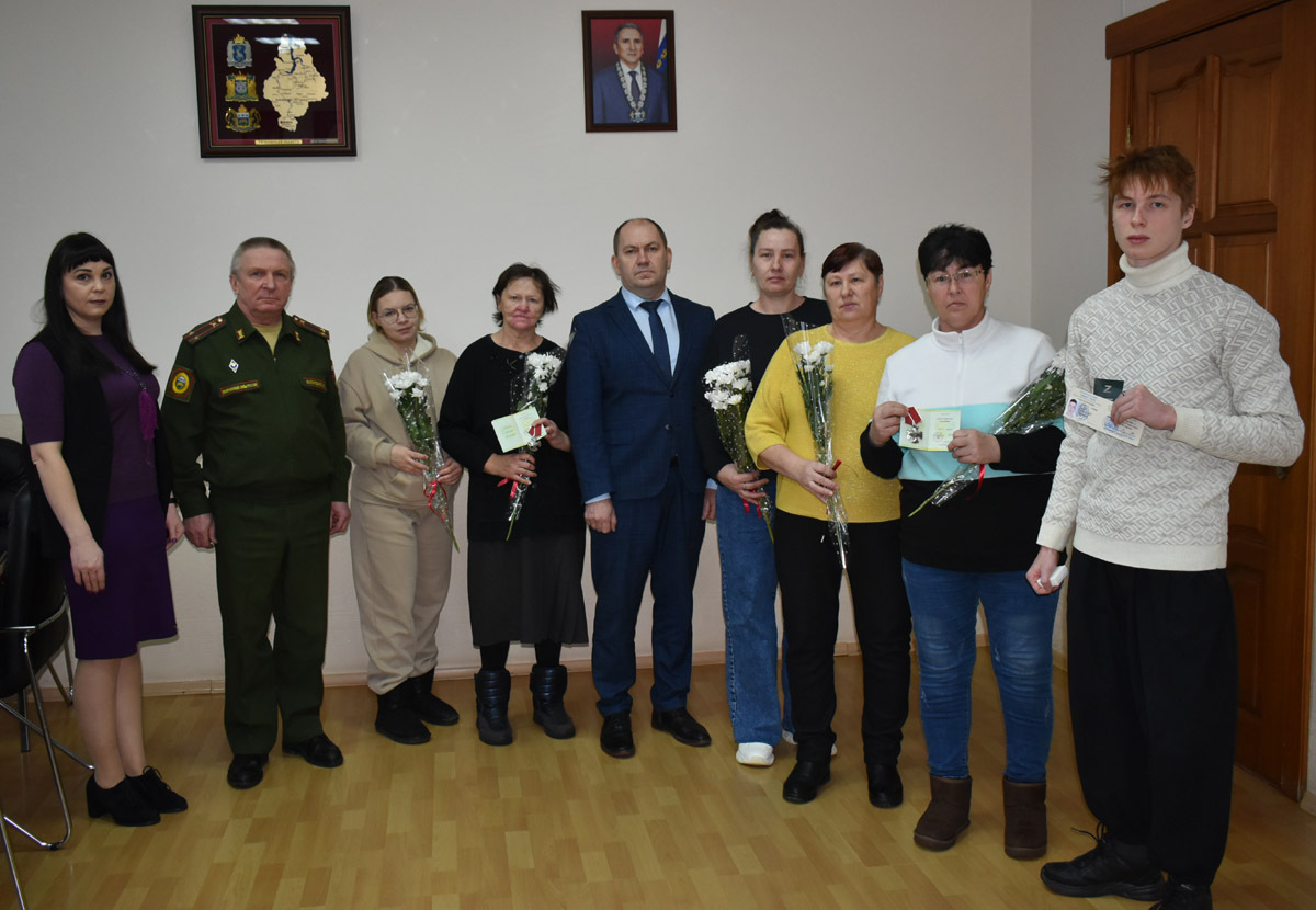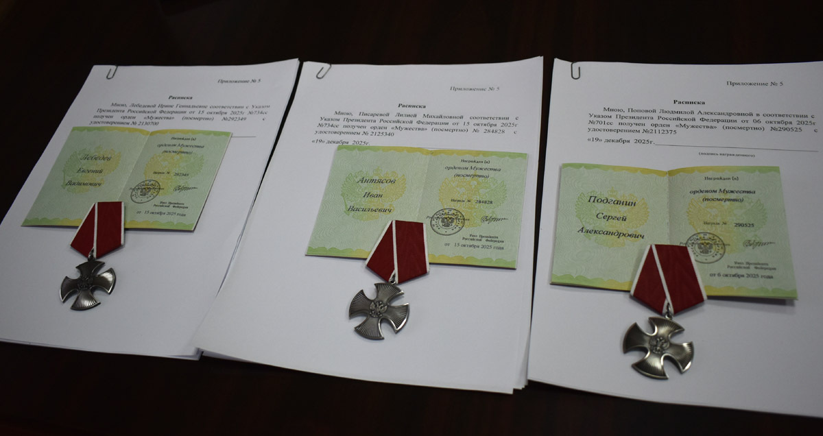 Посмертные награды героев Отечества были переданы Ирине Лебедевой – маме Евгения Лебедева, Марии, Людмиле и Галине – сестрам Сергея Подганина, Лилии Писаревой – жене Ивана Антясова.