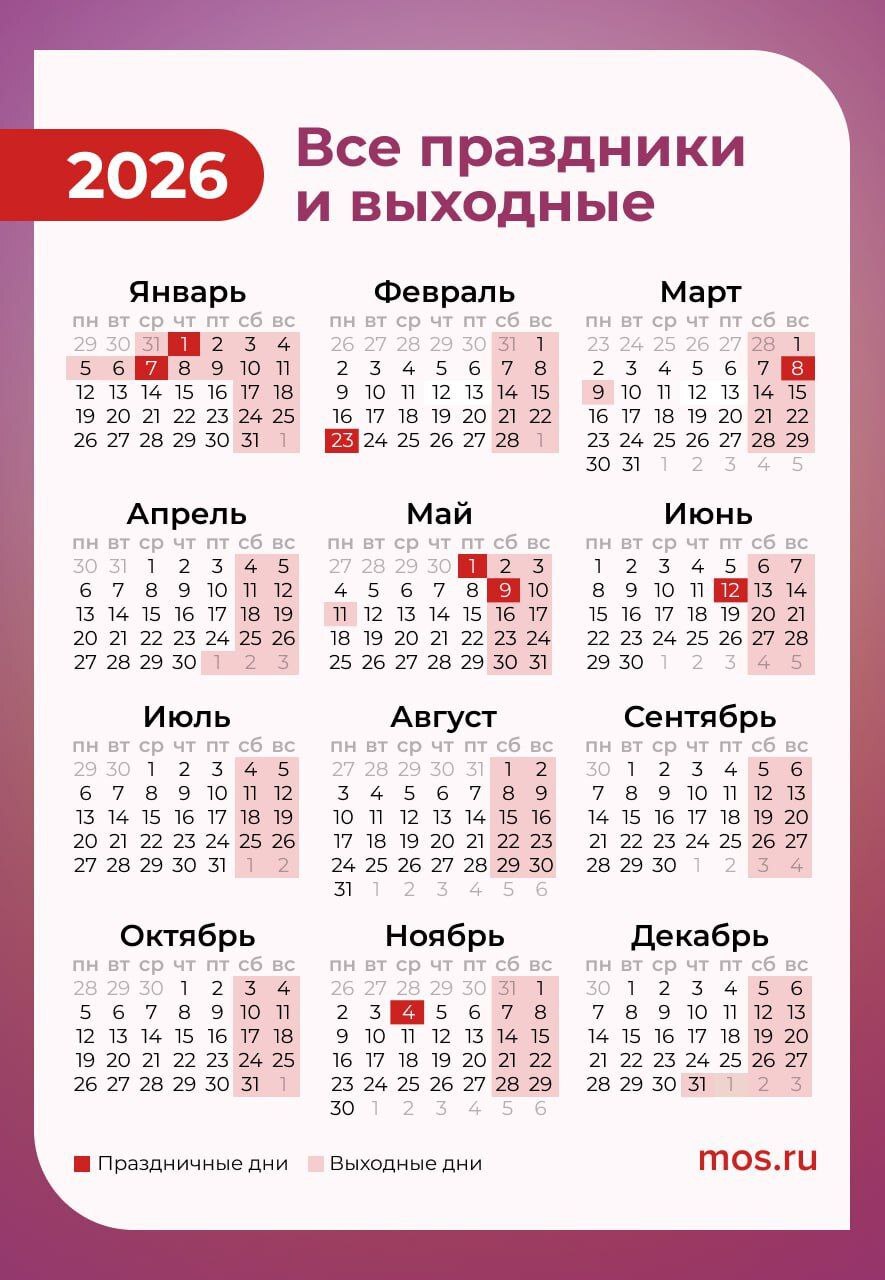 В соответствии с утверждённым производственным календарём на 2026 год период новогодних и рождественских праздников составит 12 дней: с 31 декабря 2025 года по 11 января 2026 года.