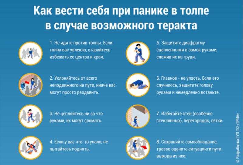 Не идите против толпы. Если толпа вас увлекла, старайтесь избежать центра и края; уклоняйтесь от всего подвижного на пути, иначе вас могут просто раздавить; не цепляйтесь ни за что руками, их могут сломать; если у вас что-то упало, не пытайтесь это поднять; защитите диафрагму сцепленными в замок руками, сложив их на груди; главное - не упасть. Если это случилось, защитите голову руками и немедленно встаньте; избегайте стен (особенно стеклянных), перегородок, сетки; сохраняйте самообладание, трезво оцените ситуацию и пути выхода из нее.