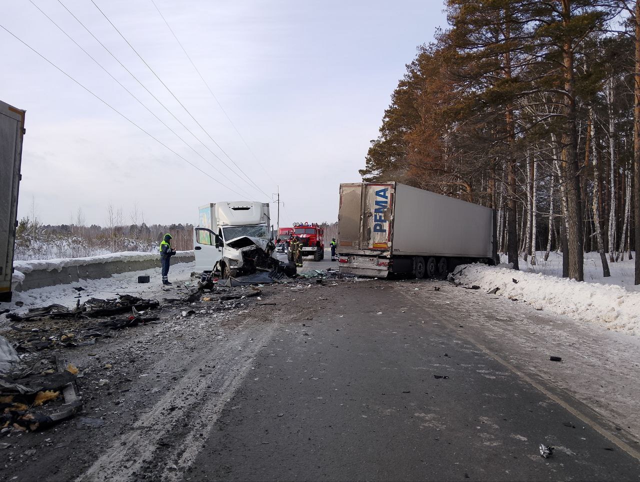 По предварительным данным, фура "Вольво" выехала на встречную полосу, касательно задев автомобиль "Лада Гранта". Далее произошло столкновение с большегрузом "КамАЗ" и автомобилем "Ауди А6", после этого - лобовой удар с автомобилем "Газель Некст". Большегруз "Вольво" в результате съехал в кювет и врезался в дерево. Водитель заблокирован в кабине, его пытаются спасти.