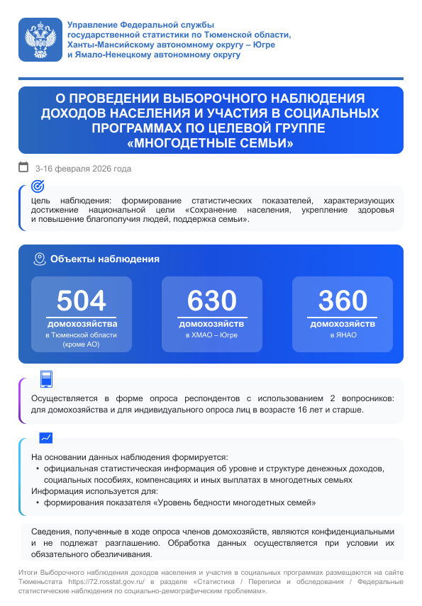 Итоги выборочного наблюдения по целевой группе "многодетные семьи" послужат информационной основой для формирования Росстатом показателя "Уровень бедности многодетных семей" по субъектам Российской Федерации и будут размещены на сайте Тюменьстата https://72.rosstat.gov.ru/ в разделе "Статистика / Переписи и обследования / Федеральные статистические наблюдения по социально-демографическим проблемам".