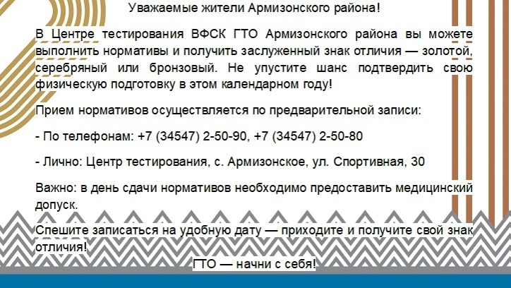 📣💪Выполнить нормативы комплекса ГТО и получить консультационно-методическую помощь можно в Центре тестирования ГТО Армизонского района по адресу: с. Армизонское, ул. Спортивная, 30. Телефонам: 8 (34547) 2-50-90, 2-50-80