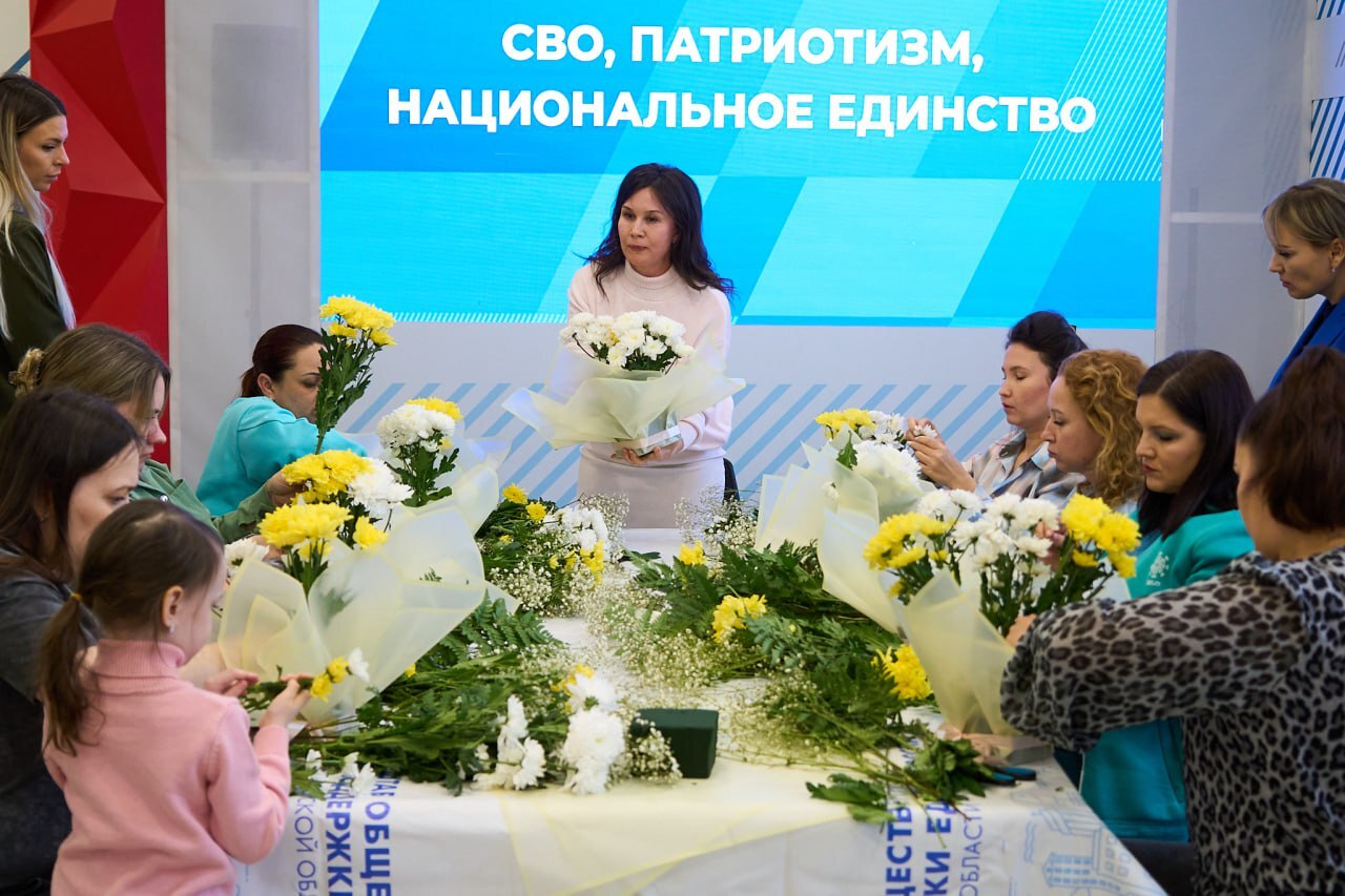 Штаб стал площадкой для реализации мероприятий в рамках проекта сторонников партии "Единая Россия" "Надежный тыл". В день экскурсии здесь проходила "Цветочная гостиная" - заместитель председателя регсовета сторонников Анна Пирожок пригласила жен и мам участников СВО на мастер-класс по составлению цветочных композиций. В таких гостиных женщины имеют возможность поделиться своими мыслями и чувствами с теми, кто их понимает.