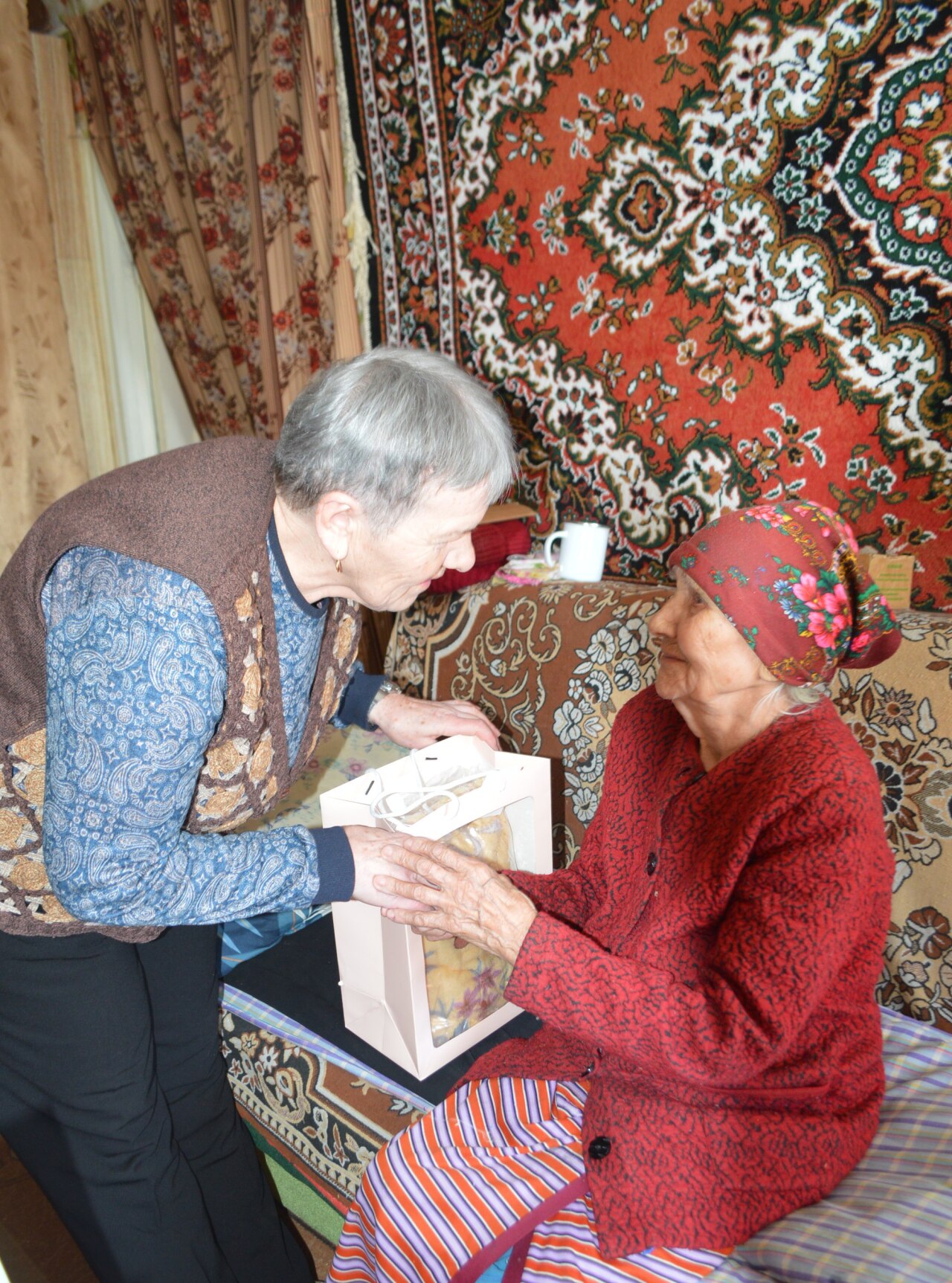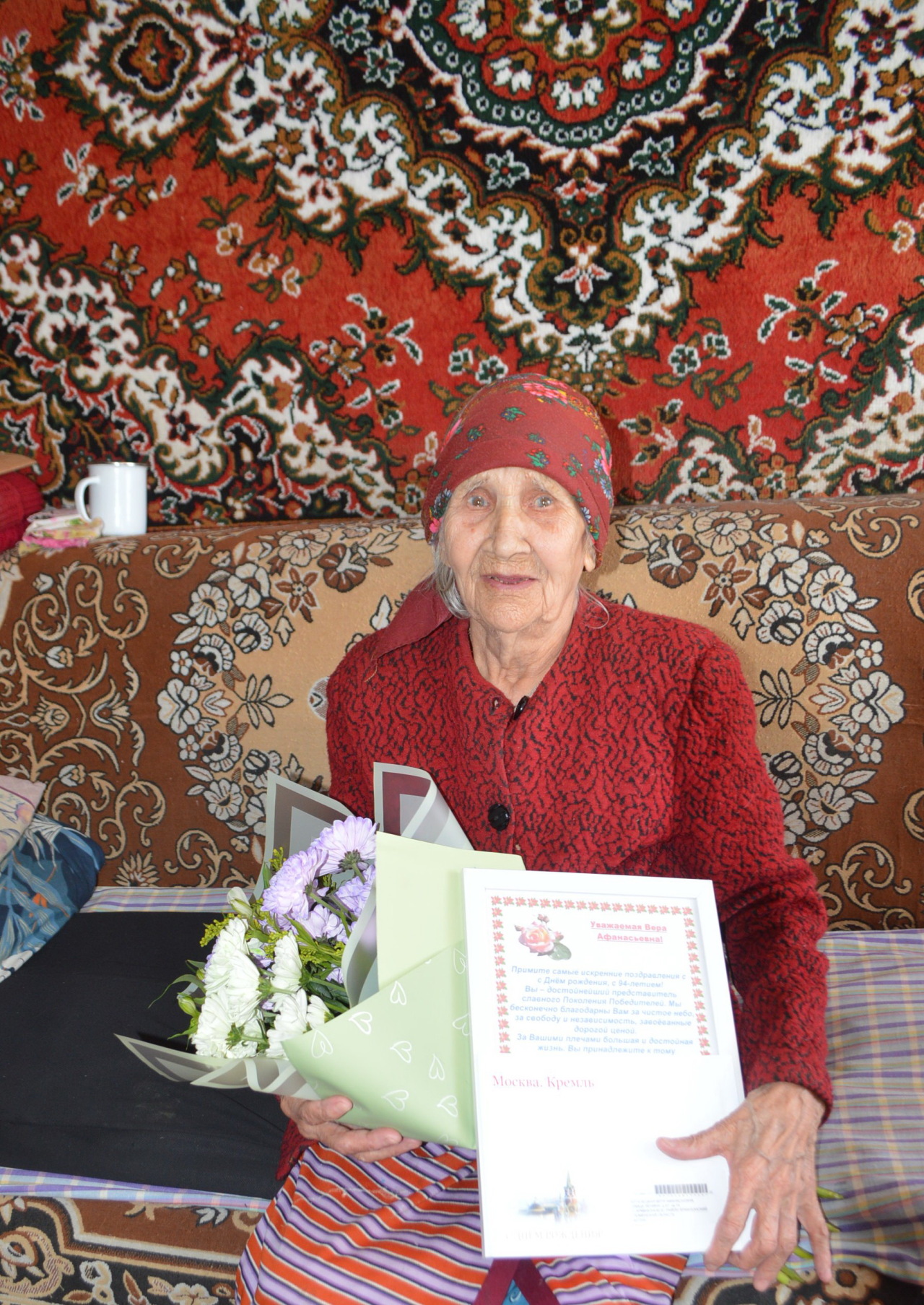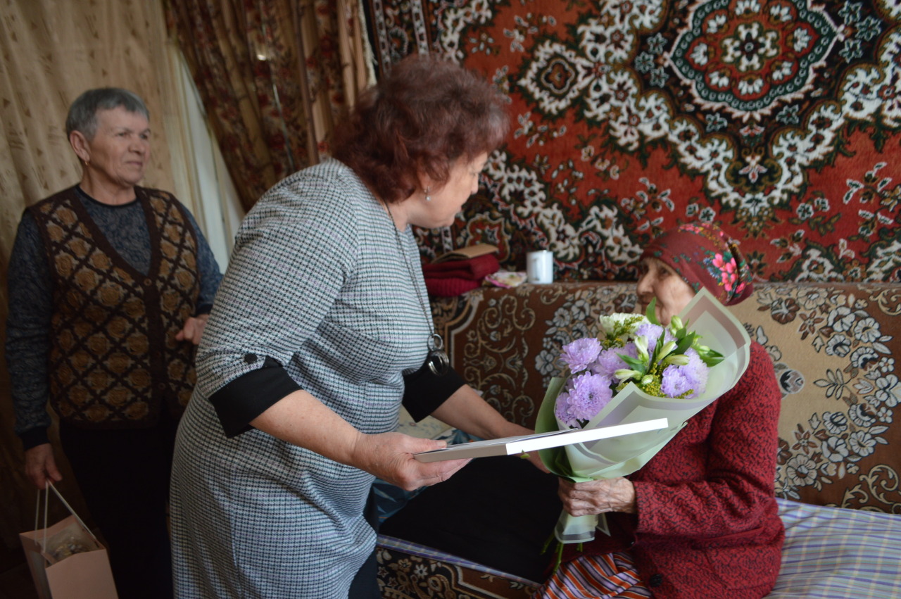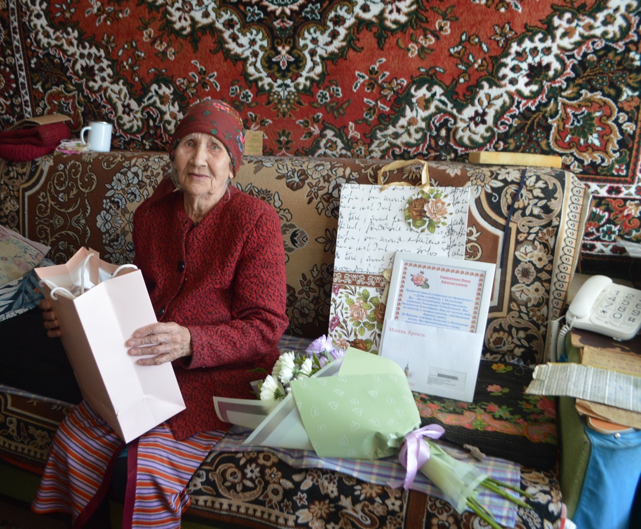 Алла Курочкина – начальник Отдела социальной защиты населения и Зинаида Букреева – представитель окружного Совета ветеранов сердечно поздравили именинницу с Днем рождения и подарили цветы. Вместе с подарками и пожеланиями здоровья, ей также была передана персональная поздравительная открытка от Президента РФ В.В. Путина и письмо-поздравление от главы округа Дмитрия Ульянова.