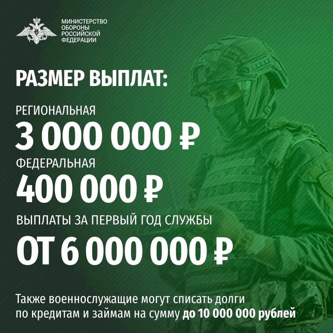 При заключении контракта с Минобороны РФ именно в военкоматах Тюменской области или в пункте отбора на военную службу по контракту в Тюмени (ул. Республики, 2/1) выплачивается 3 400 000 рублей, из них 3 000 000 - региональная выплата.