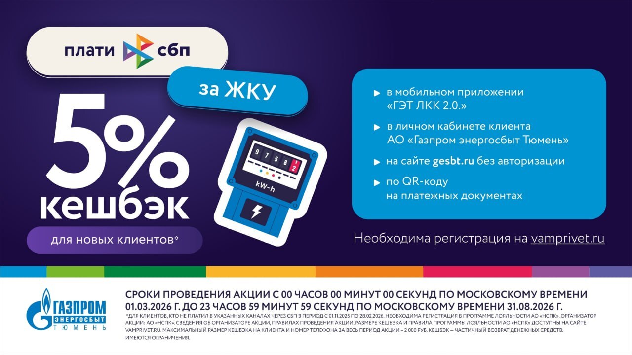 Кешбэк будет начисляться при оплате через "Личный кабинет клиента", мобильное приложение "ГЭТ ЛКК 2.0", на сайте gesbt.ru и по QR-коду на платежных документах. Для участия в акции клиенты должны не производить оплату ЖКУ в указанных каналах СБП с 1 ноября 2025 года по 28 февраля 2026 года.