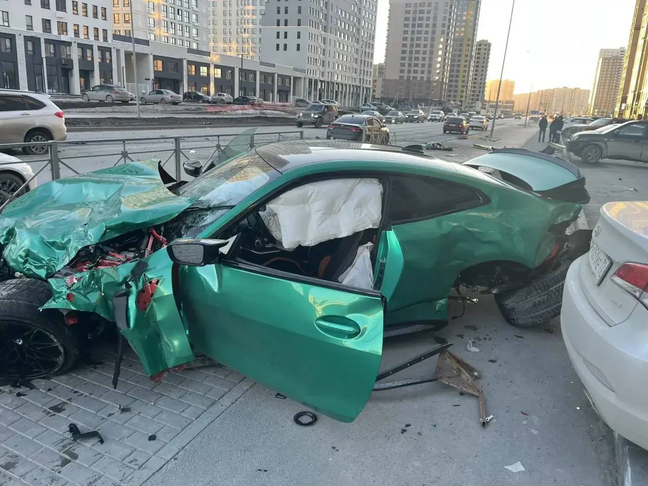 От удара "БМВ" отбросило в столб, затем на встречную полосу, где произошло столкновение с автомобилем "Хавал". В результате этого удара "БМВ" отлетел на две припаркованных машины.