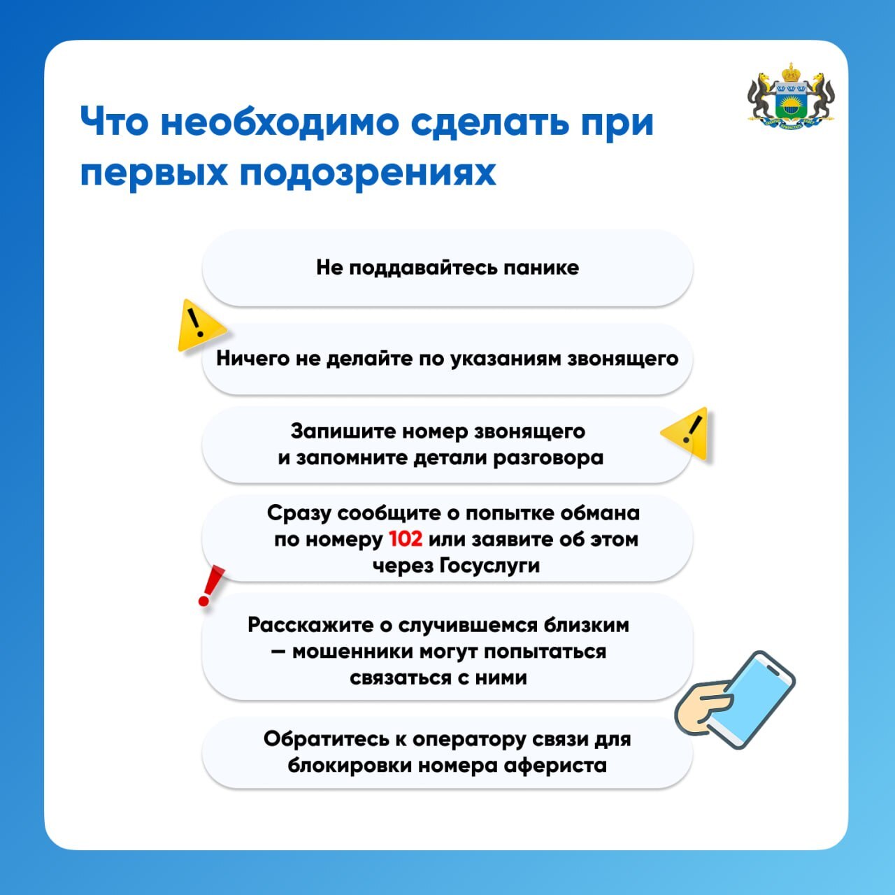 При первых признаках давления, подозрений или угроз не поддавайтесь панике. Не делайте того, о чем просят по телефону, даже если угрожают. Запишите номер звонящего и сразу сообщите о попытке обмана в полицию по номеру 102 или заявите об этом через Госуслуги (https://www.gosuslugi.ru/600465/1/form). Также вы можете обратиться к оператору связи для блокировки номера афериста.