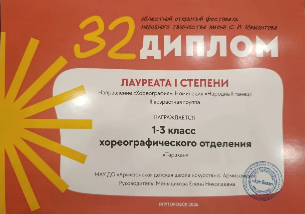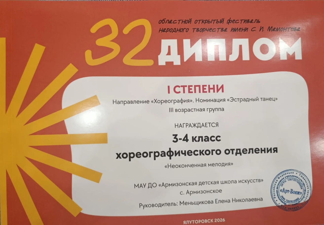 На прошлой неделе в городе Ялуторовске проходил XXXII Областной открытый фестиваль народного творчества имени С.И. Мамонтова, в котором приняли участие и обучающиеся хореографического отделения Армизонской детской школы искусств.