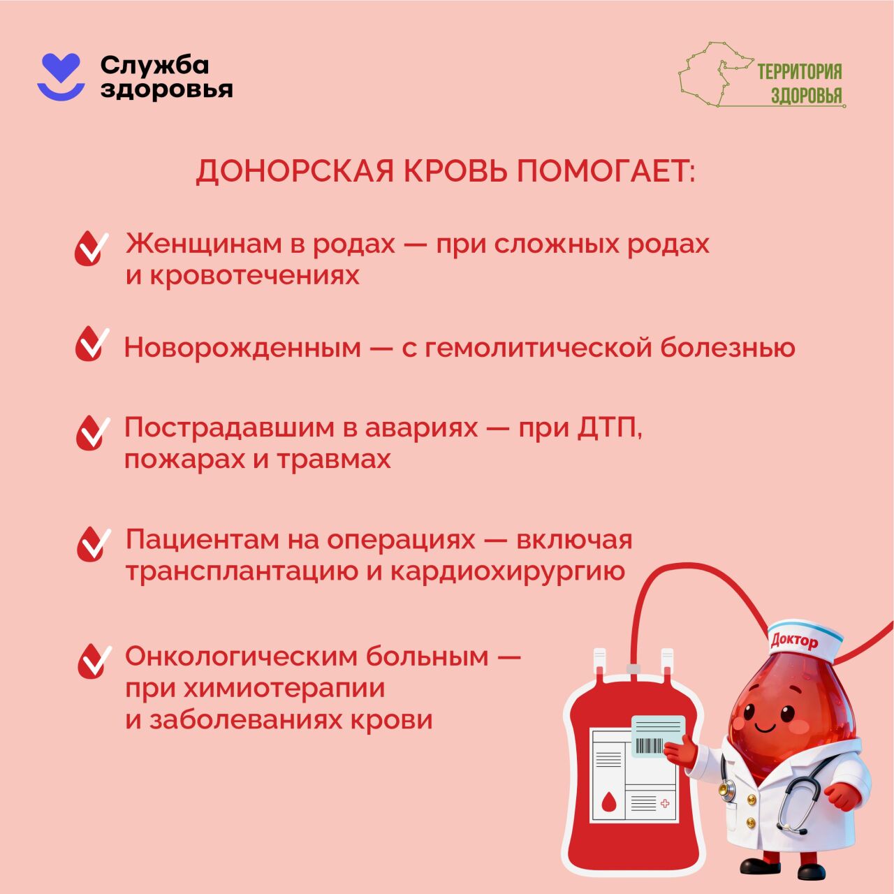 🩸 Кровь нужна каждый день: при авариях, сложных операциях, родах и лечении анемии.