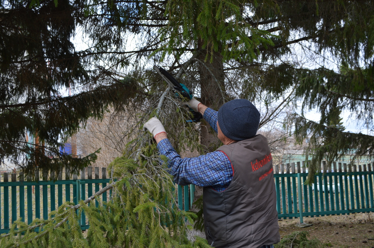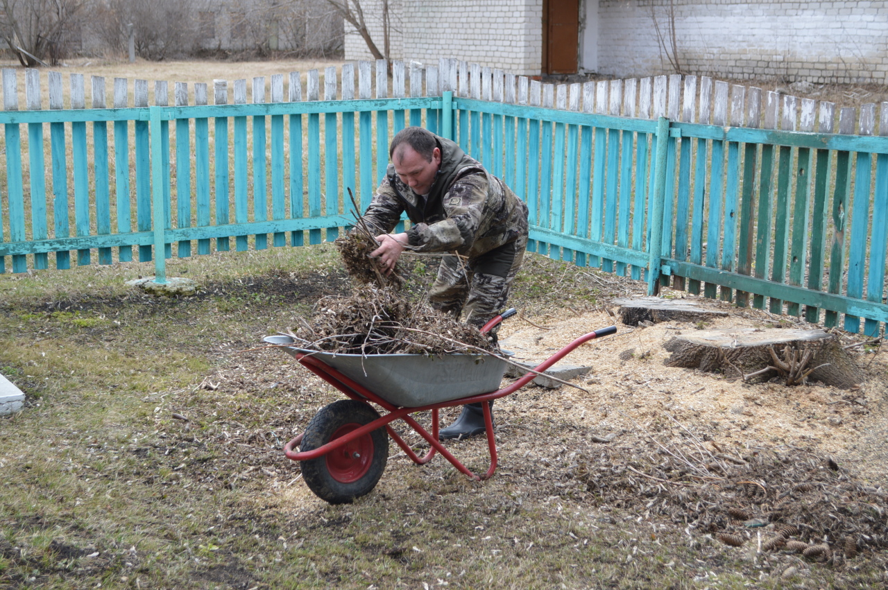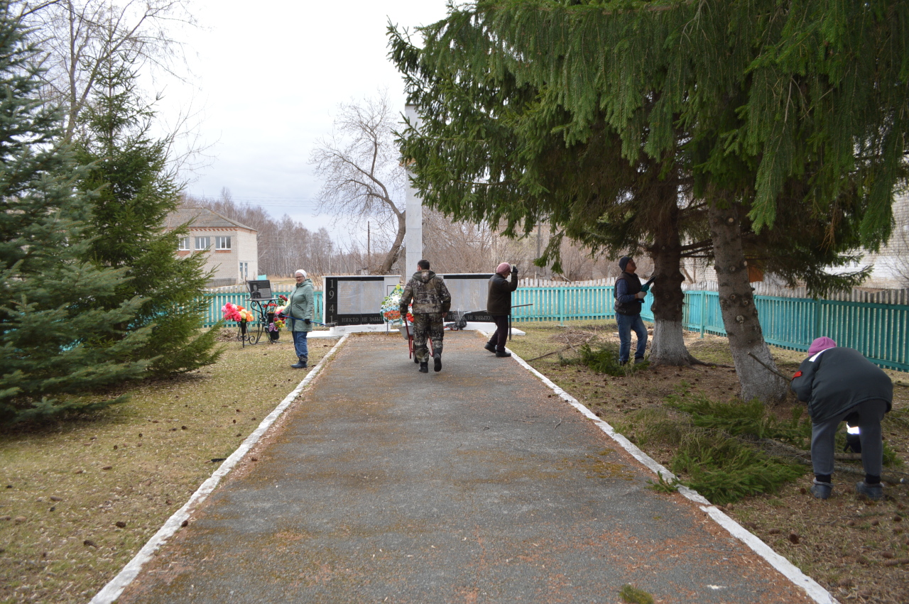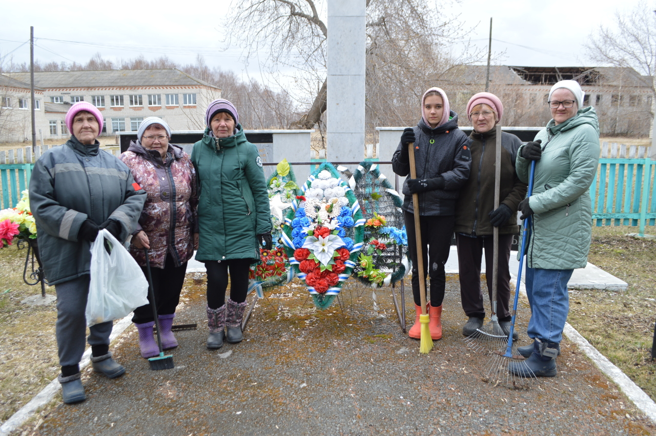Люди, вооружившись мётлами, граблями, вёдрами и мешками для мусора, сгребали листву, прошлогоднюю траву, подметали дорожку, спиливали сухие ветки, чтобы это священное для сельчан место было ещё более красивым. Работа буквально "кипела". Каждый, кто пришёл на субботник, внёс свой посильный вклад в сохранение чистоты и порядка там, где увековечен подвиг героев-земляков.