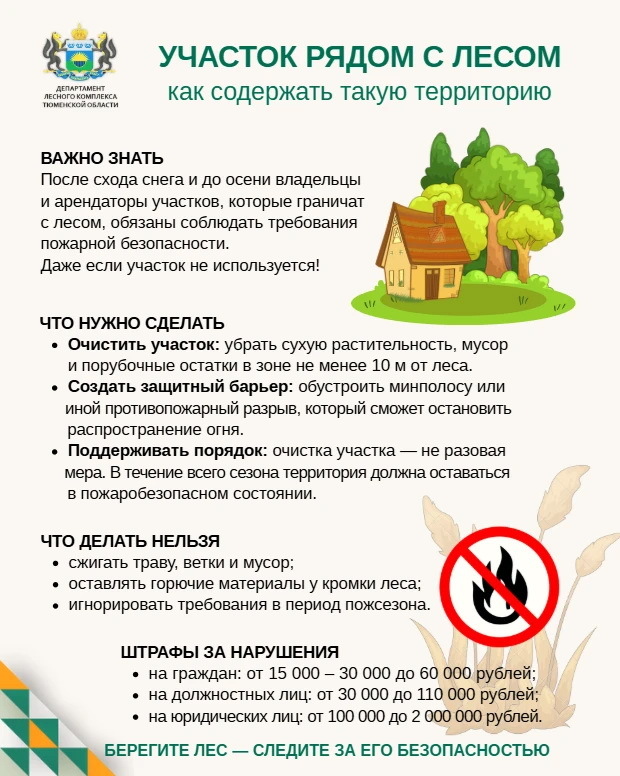 Требования к содержанию граничащих с лесом участков закреплены правилами пожарной безопасности в лесах и находятся под контролем сотрудников лесной охраны, которые регулярно патрулируют территории.