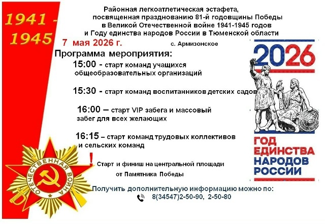 📢 Приглашаем принять участие в районной легкоатлетической эстафете, посвященной празднованию 81-й годовщины Победы в Великой Отечественной войне 1941-1945 годов и Году единства народов России в Тюменской области.