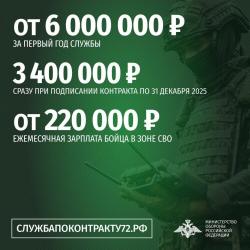 ДалееВ Тюменской области при подписании контракта по 31 декабря размер выплат составляет 3 400 000 рублей сразу, за первый год службы - 6 000 000 рублей. ✅ Бойцы могут списать долги до 10 000 000 рублей. …