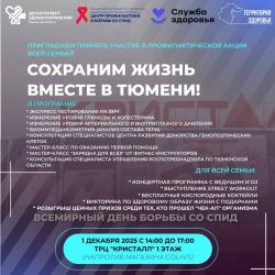 В трех городах региона 1 декабря состоится профилактическая акция "Сохраним жизнь вместе!", приуроченная ко Всемирному дню борьбы со СПИД: 📍 г. Тюмень, ул.Дмитрия Менделеева, 1А, ТРЦ "Кристалл". 🕗 …